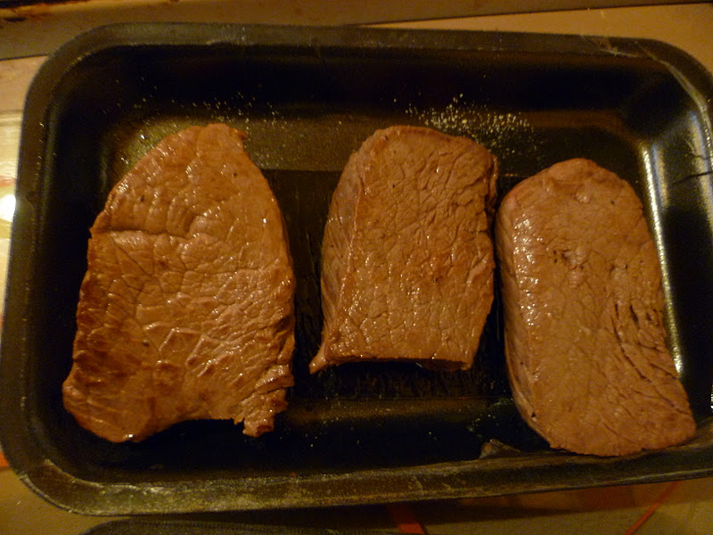 – faire cuire dans une poêle beurrée bien chaude les morceaux de boeuf salés et poivrés, 30 secondes sur chaque face (même les côtés). Puis réserver.