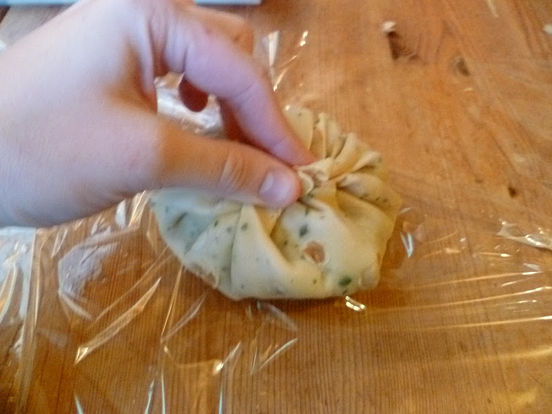 – entourer l’aumônière de pâte feuilletée, et dessiner sur le dessus de la pâte des lignes en partant du centre vers les côtés