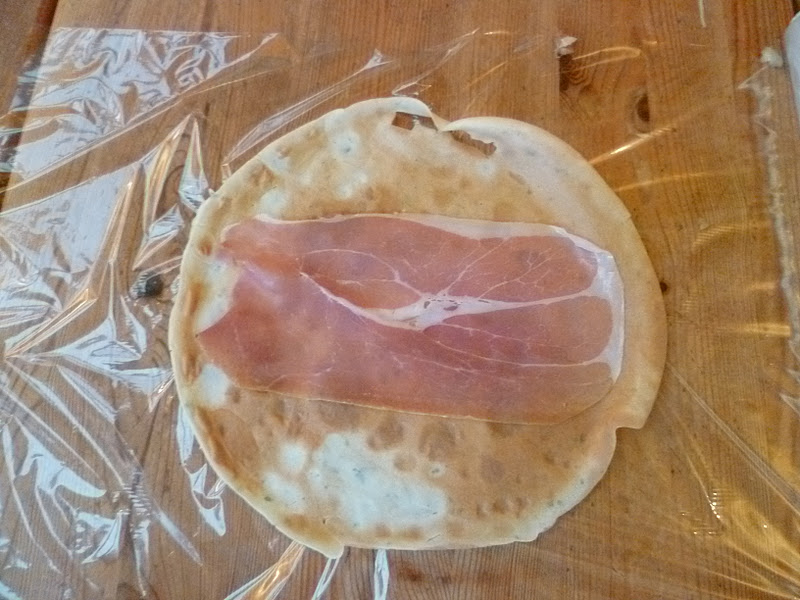 – disposer une feuille de papier film sur la table, poser une crêpe dessus puis une tranche de jambon de parme