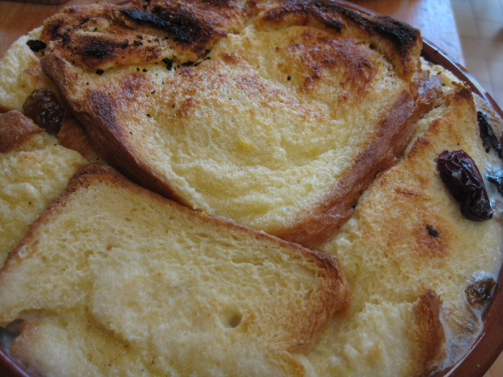 – pendant ce temps disposer une couche de brioche dans le plat, ajouter des raisins (la moitié) puis seconde voir une troisième couche de brioche , ajouter les raisins restants.