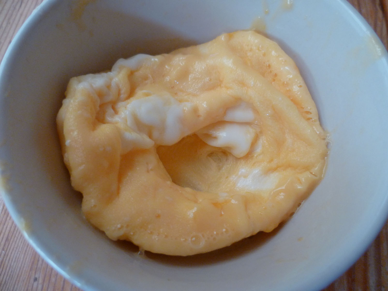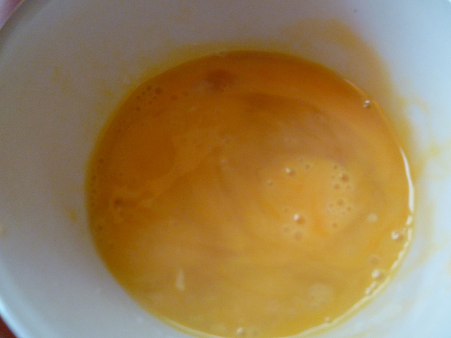 – Pendant ce temps casser l’œuf dans un petit ramequin (du diamètre du muffin) le fouetter avec une fourchette pour mélanger le jaune et le blanc