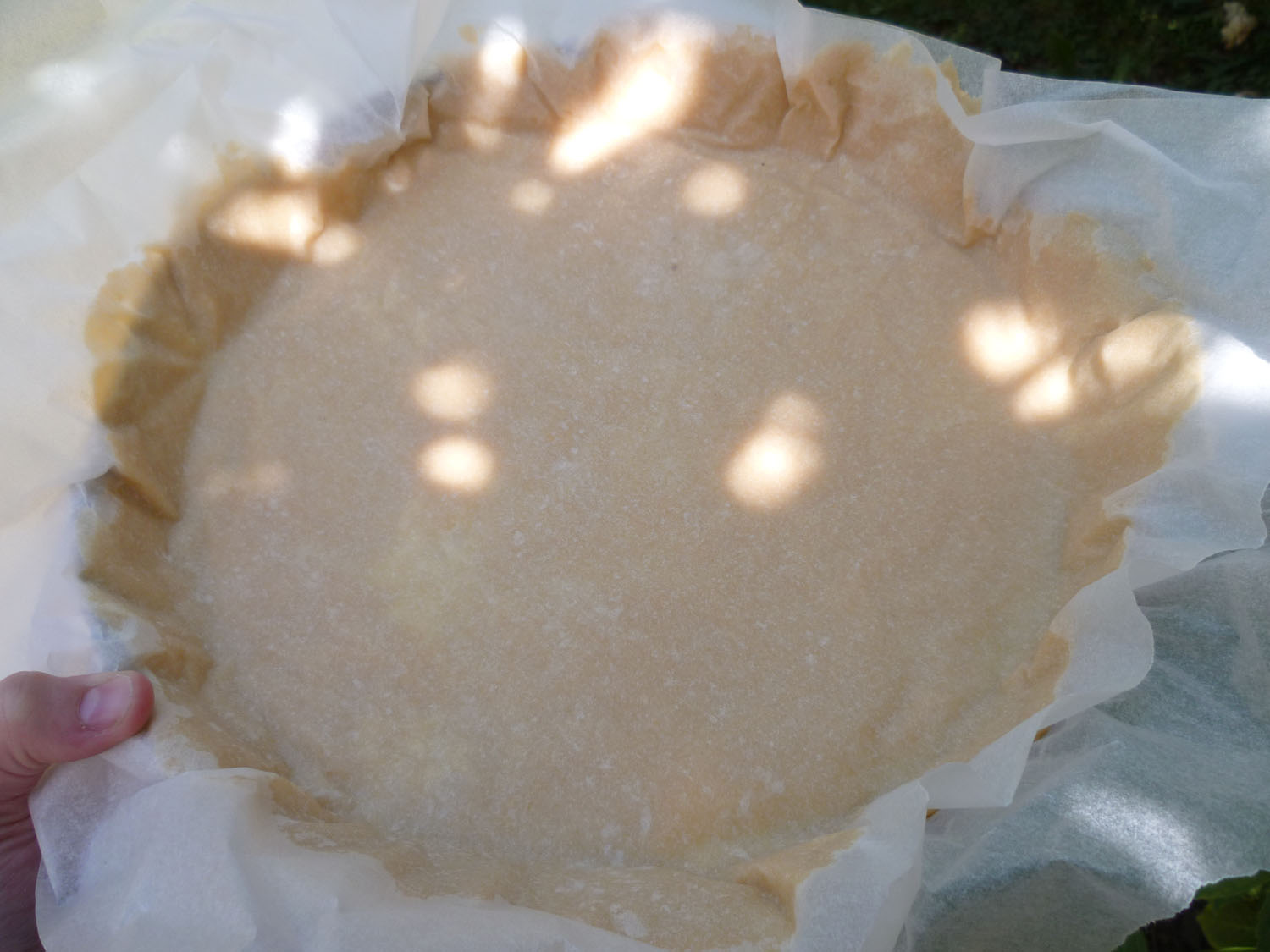 – disposer la pâte sur un plan de travail fariné, l’étaler avec un rouleau à pâtisserie puis la disposer sur un plat à tarte . (en ayant mis du papier sulfurisé au préalable)